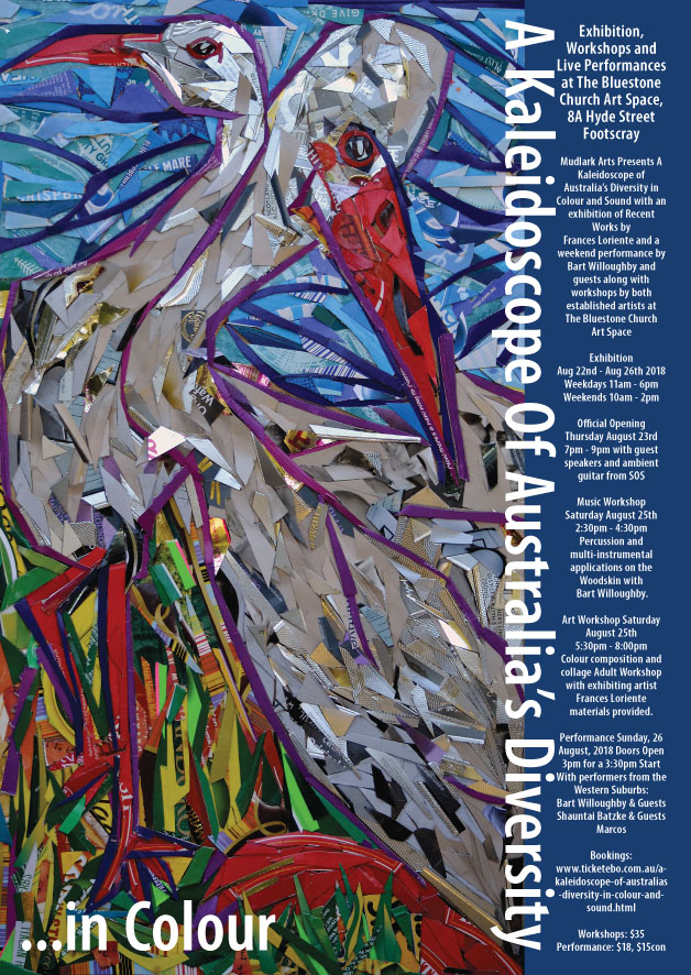Mudlark Arts Presents A Kaleidoscope of Australia’s Diversity in Colour and Sound with an exhibition of Recent Works by Frances Loriente and a weekend performance by Bart Willoughby and guests along with workshops by both established artists at The Bluestone Church Art Space